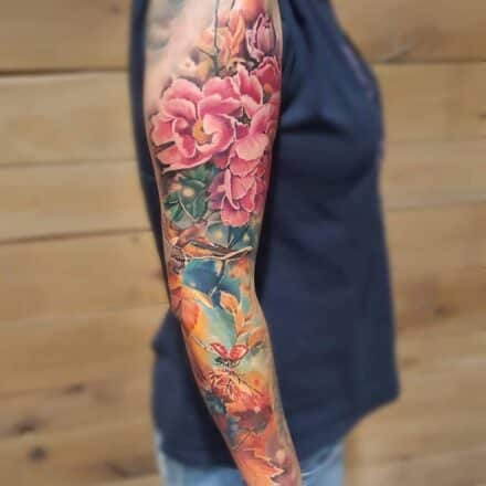 Pro berušku typická červená barva na tomto motivu nesmí chybět. Když ji doplníte květinou, lístkem, nebo dokonce čtyřlístkem, přenesete na své tělo nádherný kousek přírody.