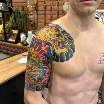 Hledáte tetování, které kombinuje sílu a majestátnost? Výborně! Drak je v mnoha kulturách považován za mocného a mystického tvora. V čínské kultuře je symbolem síly, ochrany a štěstí. Čínský drak je navíc často vyobrazen s ocasem v plamenech, se šupinami a charakteristickým prohnutým tělem, které spíše připomíná tvar hada. Vyniká tak svou odvahou, schopností překonávat překážky a upozorňuje na mocný vliv přírody.