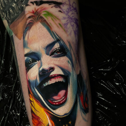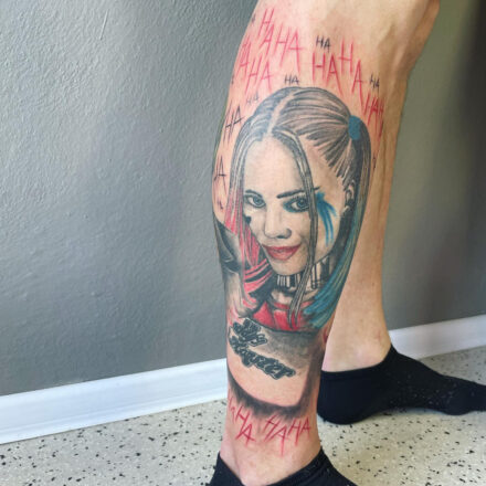 Mezi nejčastější motivy tetování s tématikou Harley Quinn patří její ikonický portrét inspirovaný filmovými nebo komiksovými verzemi postavy. Oblíbené jsou také červené a černé kosočtverce, které odkazují na její původní kostým harlekýnky z komiksů DC a nápisy jako „Daddy’s Lil Monster“ nebo „Mad Love„. Někteří fanoušci si nechávají tetovat symboly z jejích zbraní, například baseballovou pálku nebo revolver s nápisem „Bang!“.