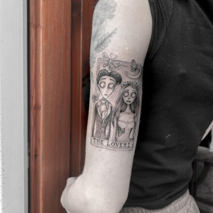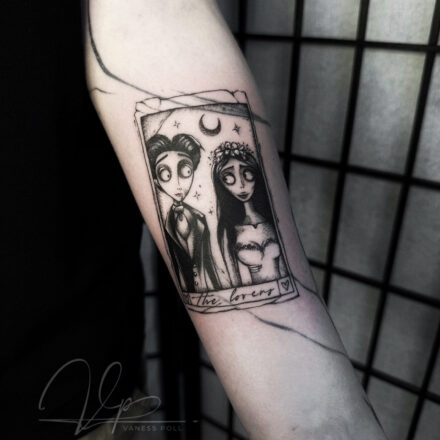 Mrtvá nevěsta je ikonická postava z animovaného filmu Tima Burtona, kde se Victor Van Dort omylem zasnoubí s mrtvou dívkou Emily. Ta se stává jeho průvodkyní v říši mrtvých, kde se odehrává příběh plný lásky, melancholie a osudu. Emily je nezaměnitelná svým gotickým vzhledem, má bledě modrou kůži, potrhané svatební šaty a smutný, ale něžný výraz. Tetování Mrtvé nevěsty symbolizuje neopětovanou lásku, věrnost a krásu v temnotě.