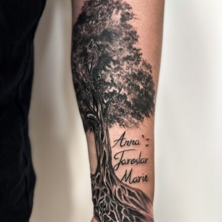 Tetování stromu rodiny dokáže v jediné kresbě zachytit to nejcennější – lásku, pouto a kořeny, ze kterých člověk vyrůstá. Jména nebo iniciály písmen blízkých se často objevují mezi větvemi, v listech nebo přímo v kmenu, kde vytvářejí živý rodokmen na kůži. Oblíbeným motivem je strom s rozvětvenými kořeny, které se stylizují do podoby příjmení nebo významného data, jako připomínka toho, odkud pocházíme.