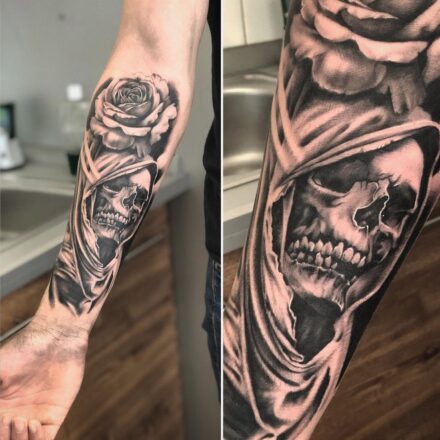 Tetování lebky a hodin je připomínkou neúprosného plynutí času a nevyhnutelnosti konce. Hodiny symbolizují, jak rychle nám čas protéká mezi prsty, zatímco lebka nám připomíná, že život má své hranice. Tato kombinace je oblíbená mezi těmi, kteří chtějí zdůraznit důležitost každého okamžiku a rozhodli se žít svůj život naplno.