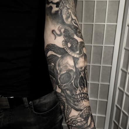 Tetování lebky a hodin je připomínkou neúprosného plynutí času a nevyhnutelnosti konce. Hodiny symbolizují, jak rychle nám čas protéká mezi prsty, zatímco lebka nám připomíná, že život má své hranice. Tato kombinace je oblíbená mezi těmi, kteří chtějí zdůraznit důležitost každého okamžiku a rozhodli se žít svůj život naplno.