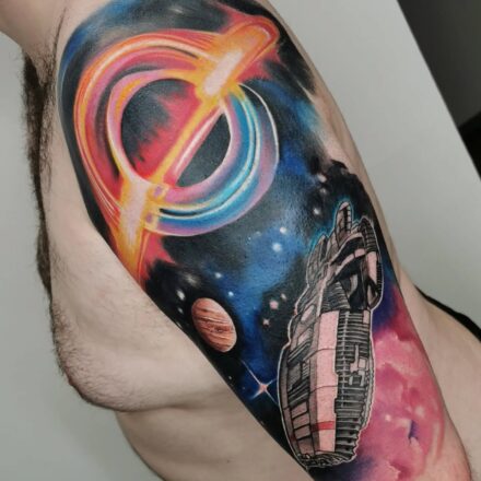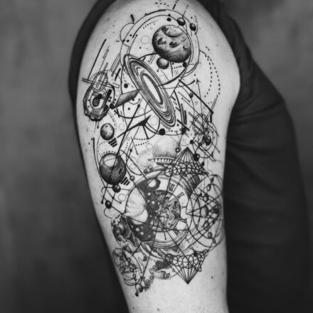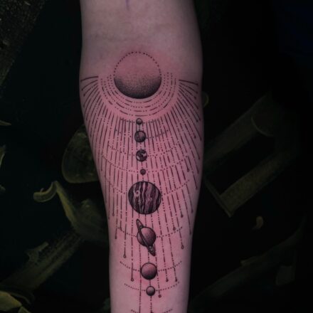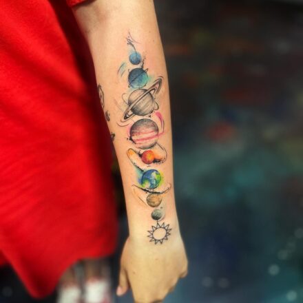 Vesmír fascinuje lidi svou nekonečností, tajemstvím a krásou, která přesahuje lidské chápání. Tetování s vesmírnou tematikou zobrazuje planety, hvězdy, a to i v podobě Slunce, galaxie nebo souhvězdí a stává se tak symbolem naprosté svobody, snění a víry v nekonečné možnosti.