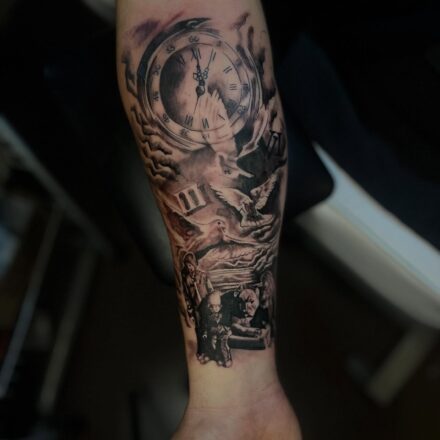 Black and grey tetování vynikne na jakékoliv části těla. Často se jedná o tetování na předloktí, záda, hrudník nebo tetování na nohy, kde může být plně využit potenciál detailního stínování a realistických obrazů.