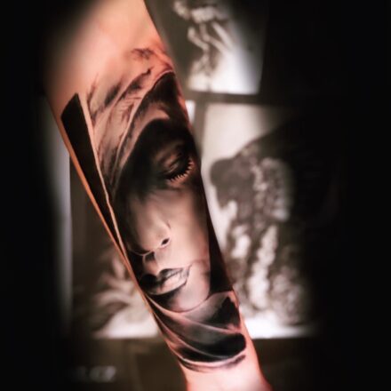 Black and grey tetování vynikne na jakékoliv části těla. Často se jedná o tetování na předloktí, záda, hrudník nebo tetování na nohy, kde může být plně využit potenciál detailního stínování a realistických obrazů.