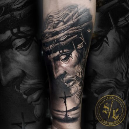Black and grey tetování vynikne na jakékoliv části těla. Často se jedná o tetování na předloktí, záda, hrudník nebo tetování na nohy, kde může být plně využit potenciál detailního stínování a realistických obrazů.