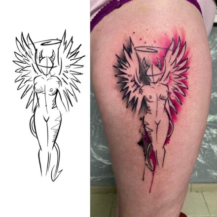 Vyznačuje se volnými, nedokončenými liniemi, které dodávají dílu dynamiku a živost. Skica tetování často kombinuje realistické prvky s abstraktními a geometrickými vzory. Většinou se provádí v černé barvě s prvky jemného stínování. Jistě vás nepřekvapí, že tatéři musí vynikat silnými dovednostmi v oblasti kresby. Díla vyžadují precizní práci s jehlami a inkoustem.