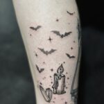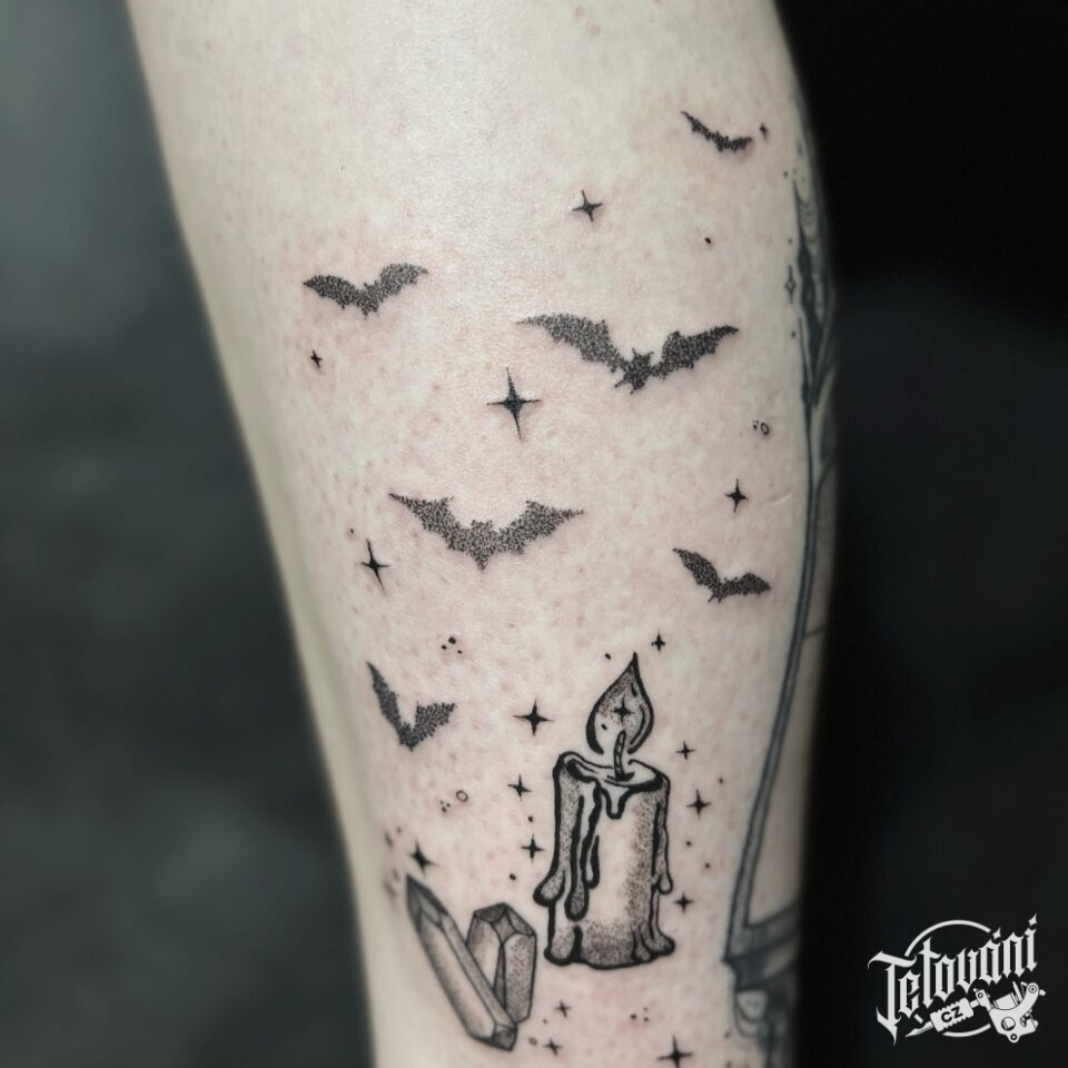 Tetování předměty, drahokamy, svíčka, netopýři na lýtku