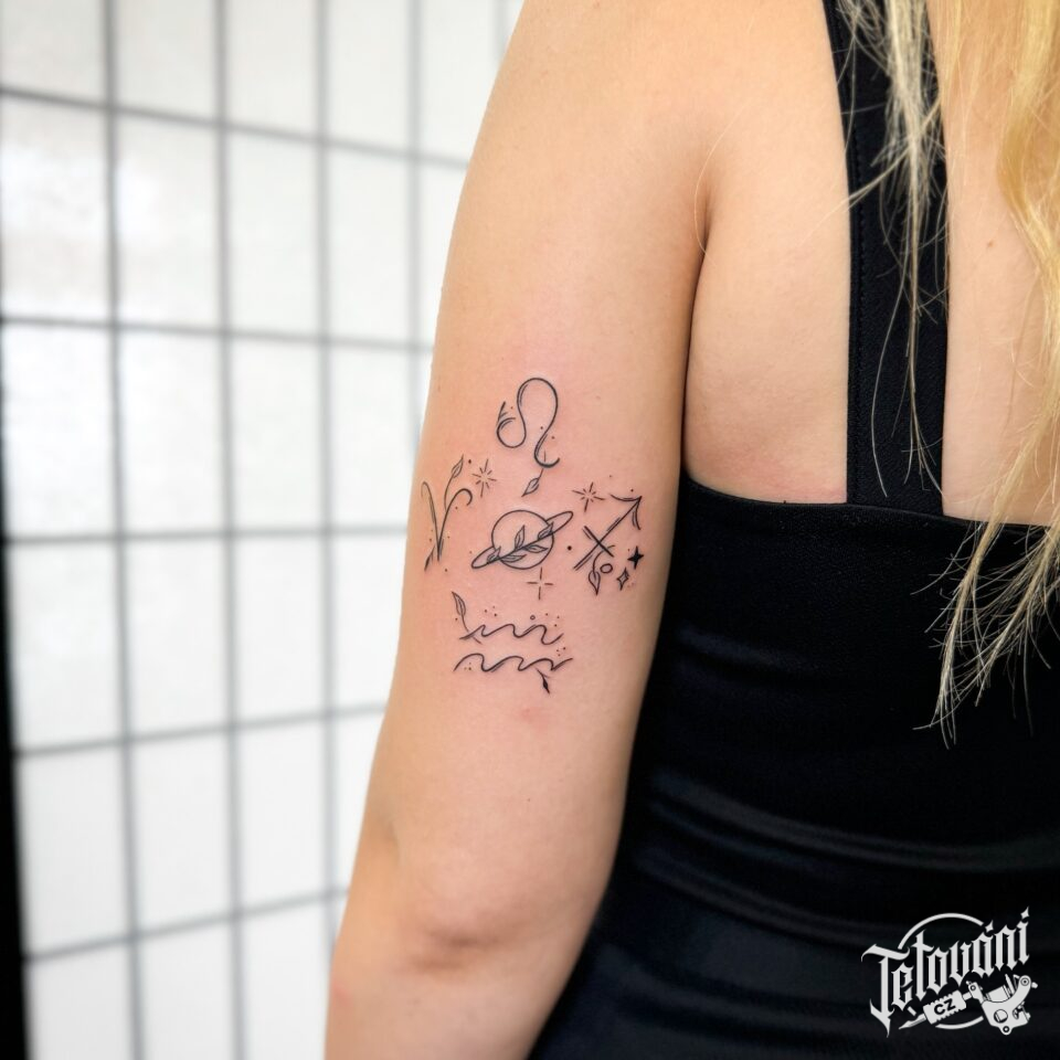 Tetování znamení zvěrokruhu, lev, vodnář, střelec, beran na rameno