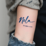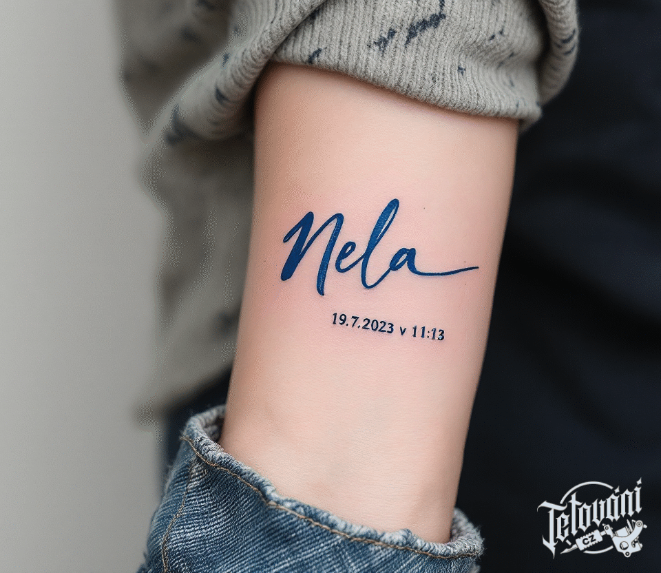 Tetování jméno dítěte Nela, datum a čas narození na předloktí