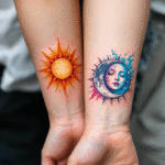 Tetování symboly rodiny, lásky, otec a dítě, slunce a měsíc na předloktí