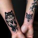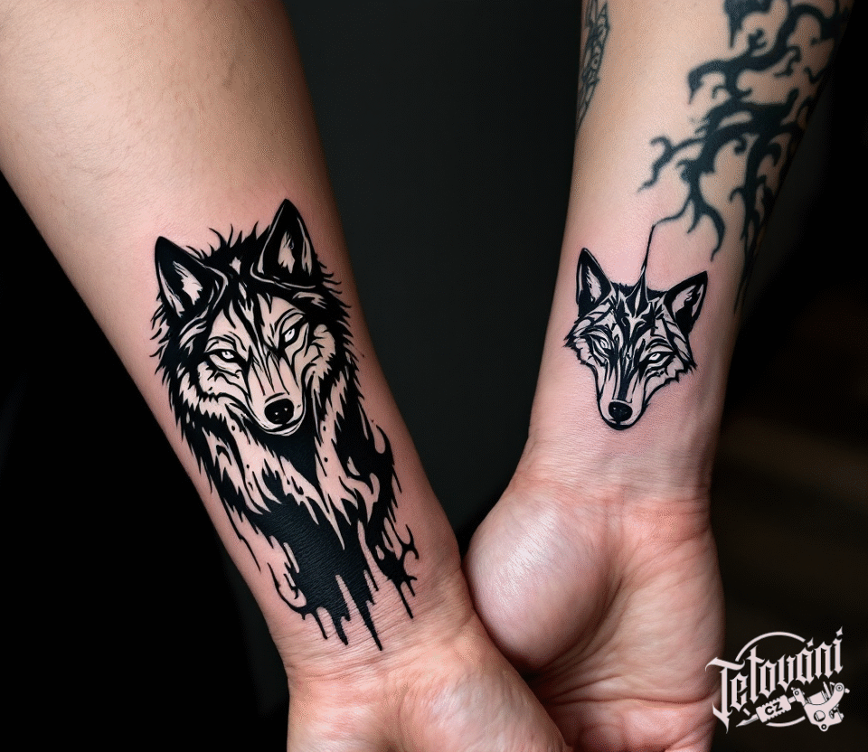 Tetování hlava vlka jako symbol lásky, rodiny, otec a dítě na předloktí