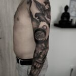 Tetování přesýpací hodiny, cestování, pírko, kompas, rukáv