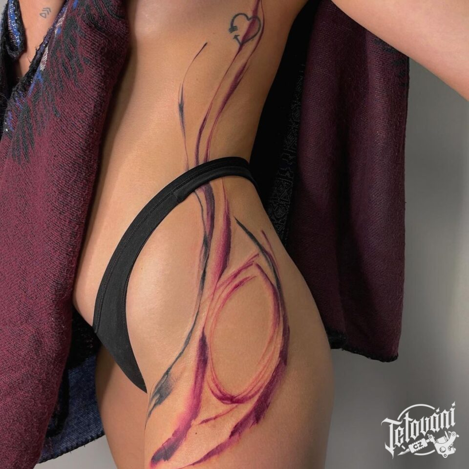 Abstraktní tetování, čáry, symboly na bok žeber a stehno