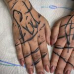 Abstraktní tetování, čáry, symboly na hřbet ruky a prsty