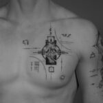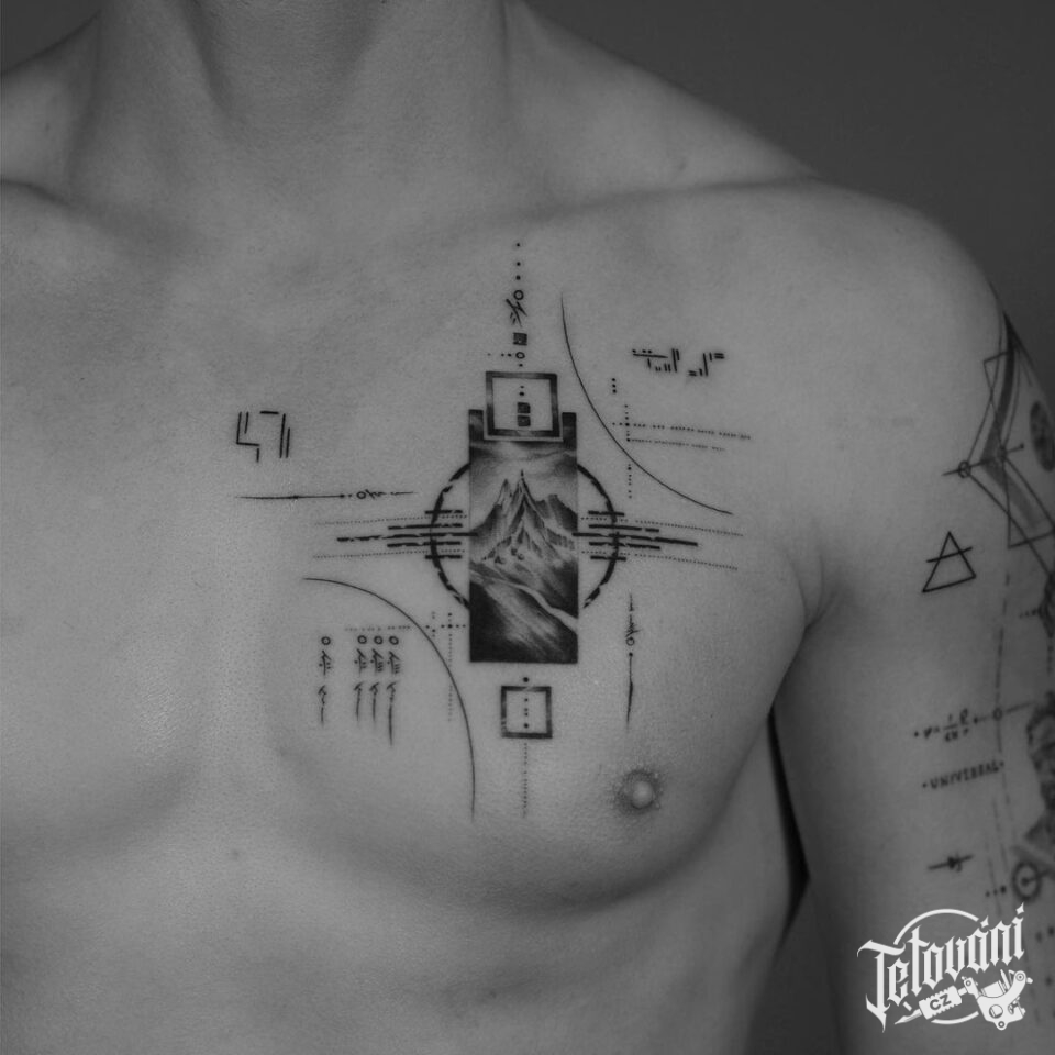 Abstraktní tetování čáry, tvary, hory na prso