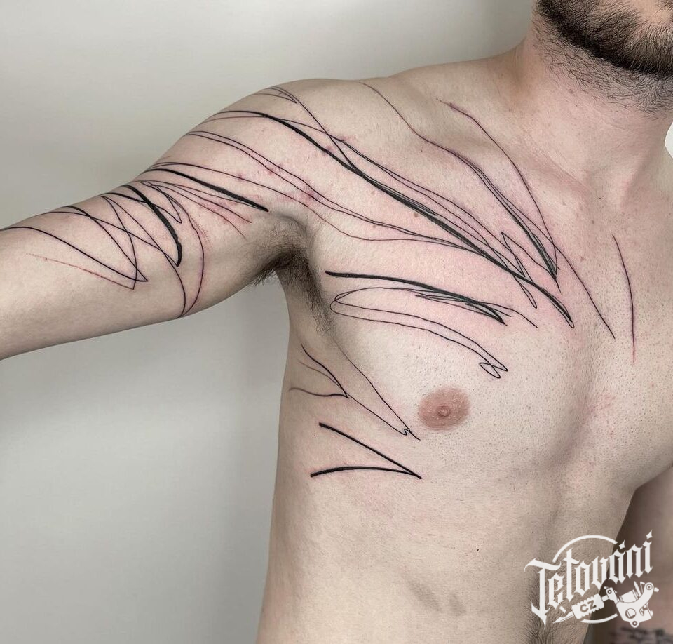 Abstraktní tetování, čáry, znaky a symboly na prso a rameno
