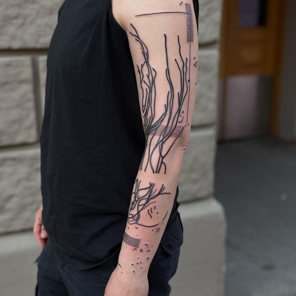 Abstraktní tetování, čáry, znaky a symboly na ruku