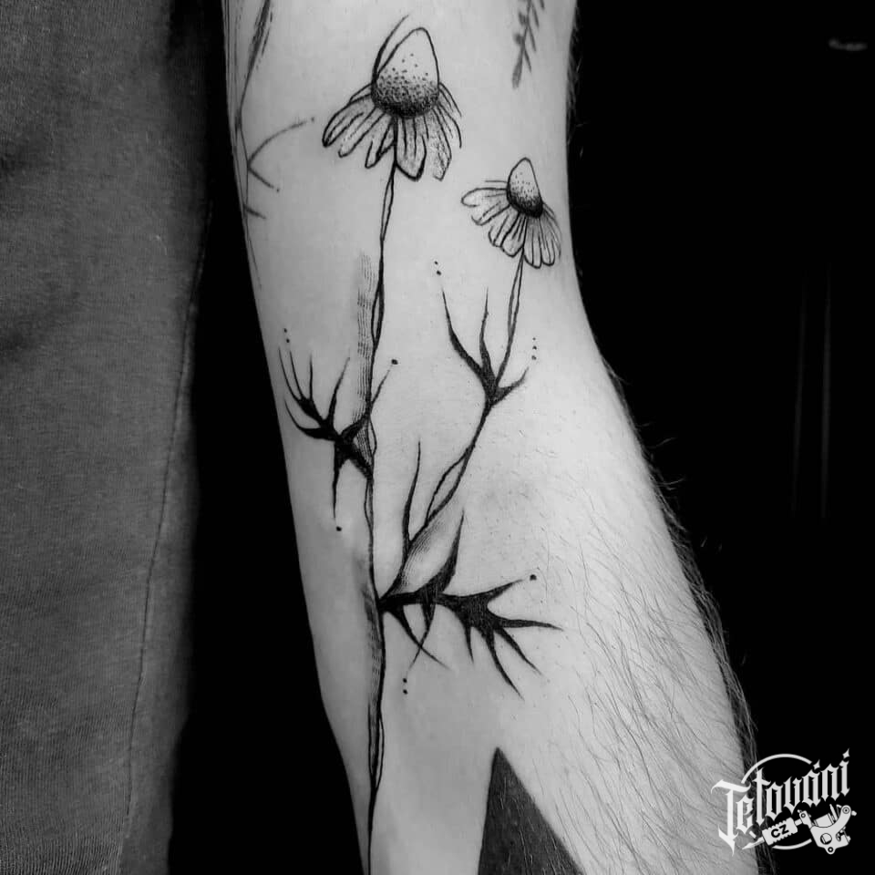 Abstraktní tetování květiny kopretiny na předloktí