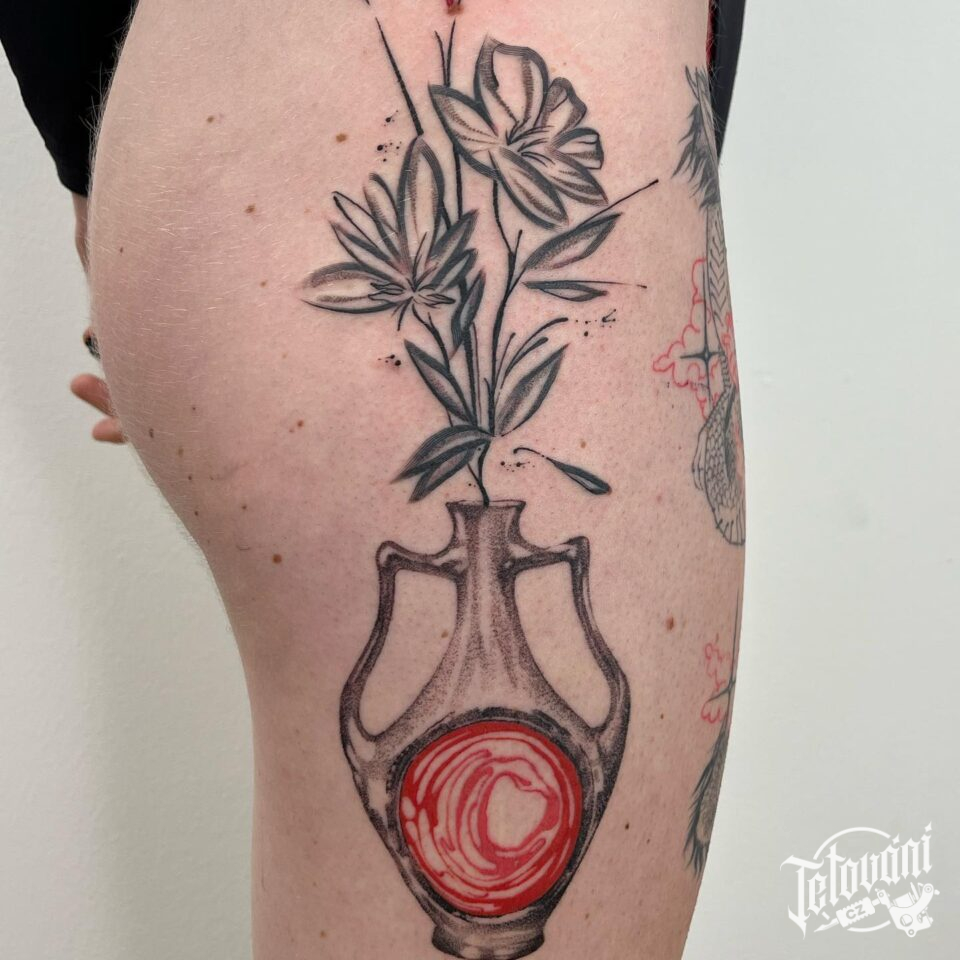 Abstraktní tetování květiny, symboly na bok stehna