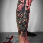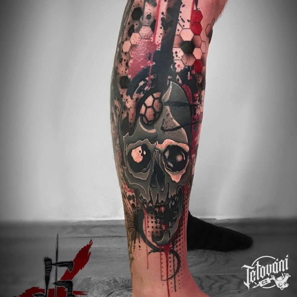 Abstraktní tetování lebka, portrét, tvary na lýtko