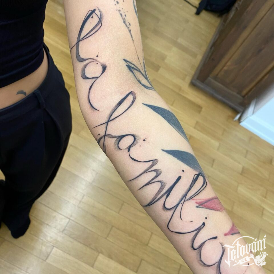 Abstraktní tetování nápis, symbol rodiny, na předloktí