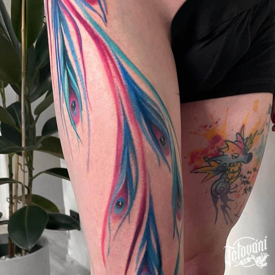 Abstraktní tetování, pták, paví oko, křídla na stehno
