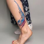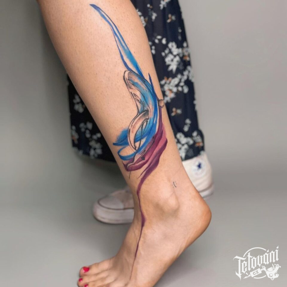 Abstraktní tetování, ryba, čáry, symboly na lýtko