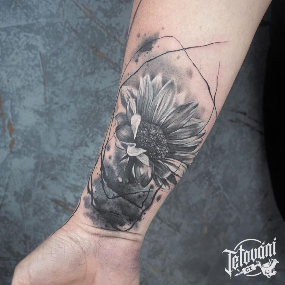 Abstraktní tetování slunečnice s čáry, pruhy na předloktí