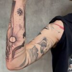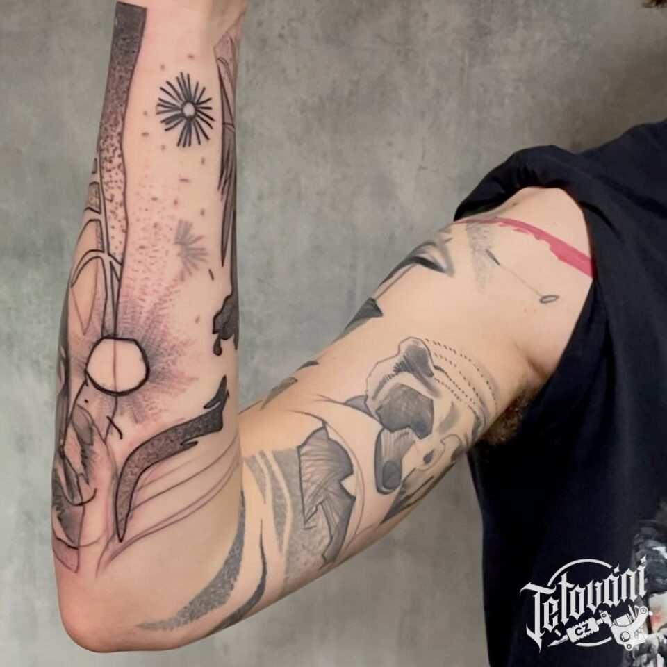 Abstraktní tetování, symboly, slunce, květiny na předloktí