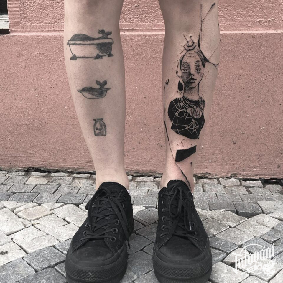 Abstraktní tetování žena na holeň