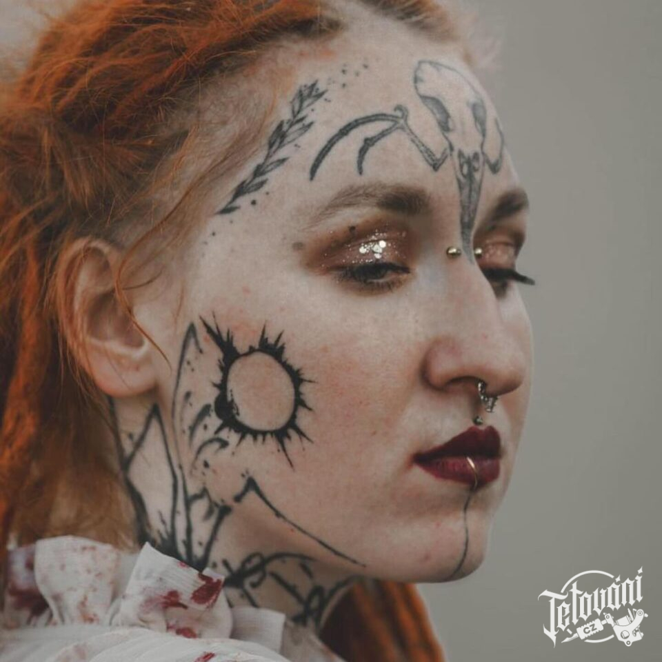 Abstraktní tetování znaky a symboly, lebka, větvička na obličej