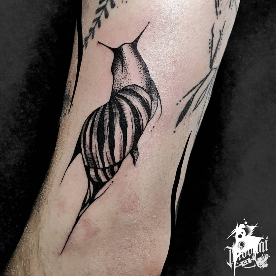 Abstraktní tetování znaky a symboly, zvíře šnek na rameno