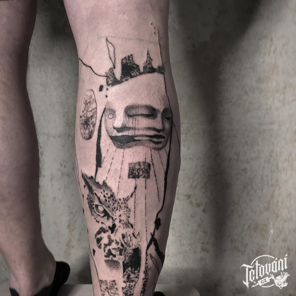 Abstraktní tetování zvíře sova, čáry, znaky a symboly na lýtko