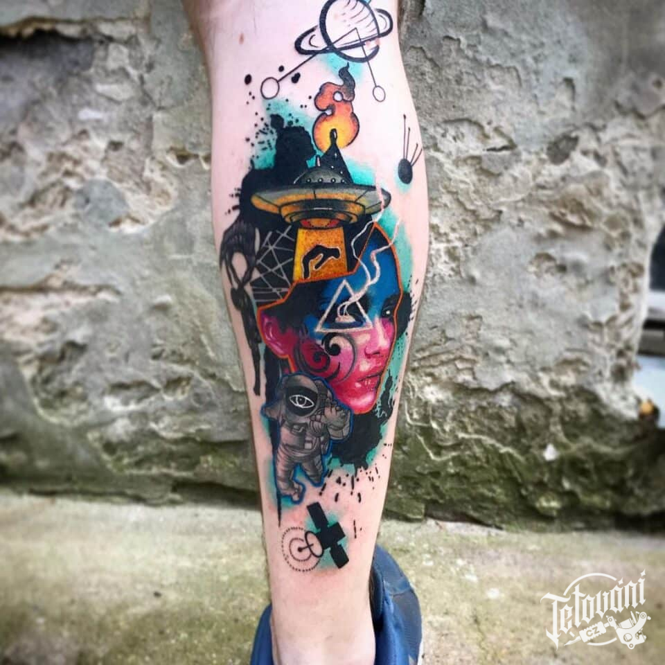 Barevné tetování, portrét ženy, vesmír na lýtko