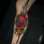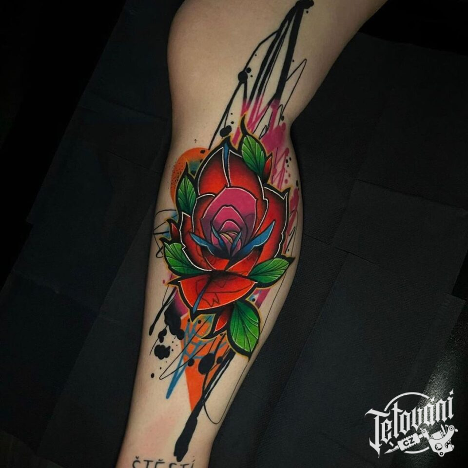 Barevné tetování růže, čáry na lýtko