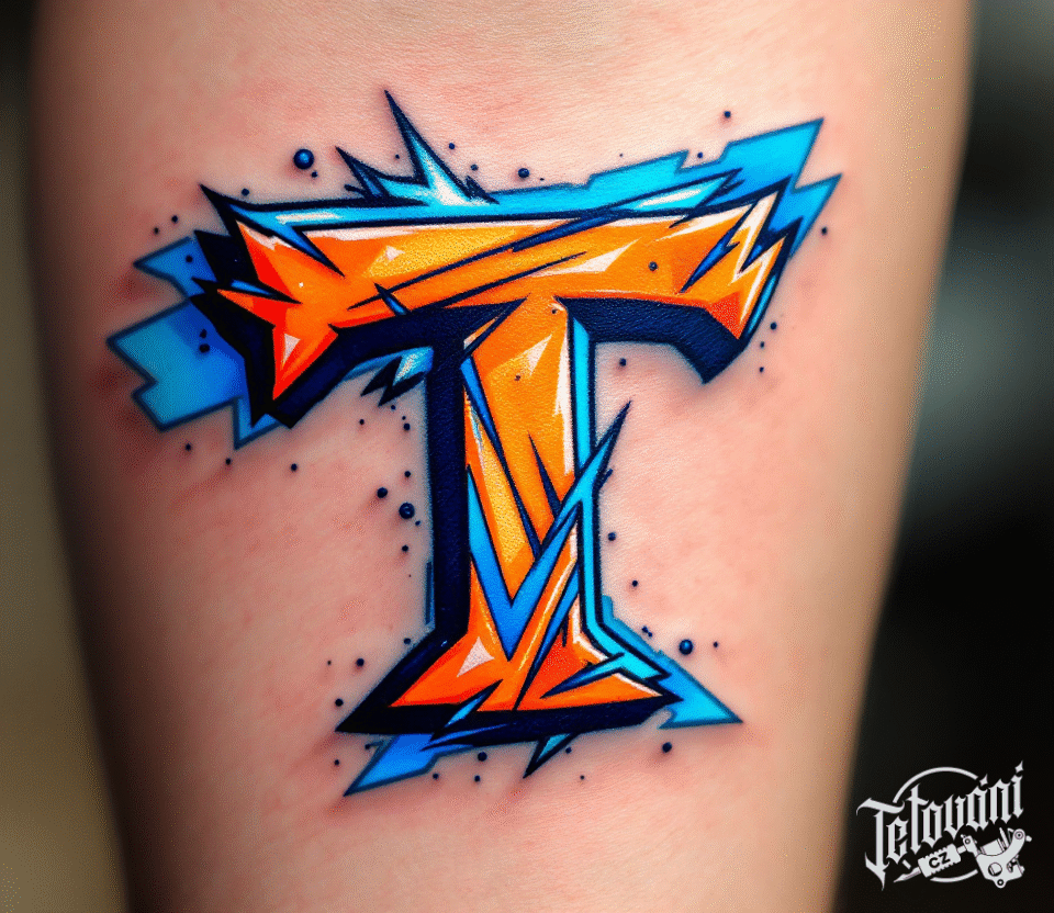 Barevné tetování ve stylu graffity, nápis, písmeno T na rameno