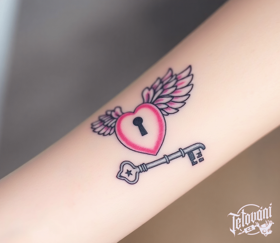Barevné tetování zámek ve tvaru srdce s křídly a zámek na předloktí