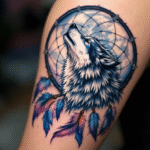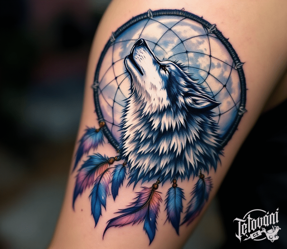 Barevné tetování zvíře vlk a lapač snů na bok stehna