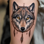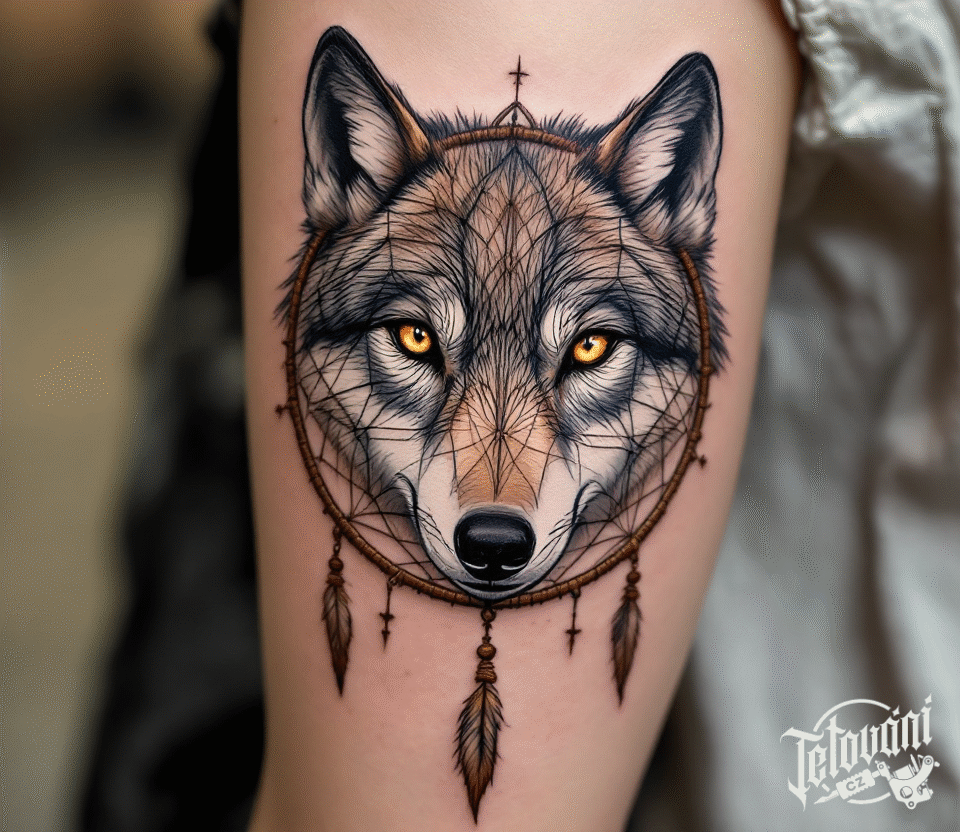 Barevné tetování zvíře vlk a lapač snů na stehno