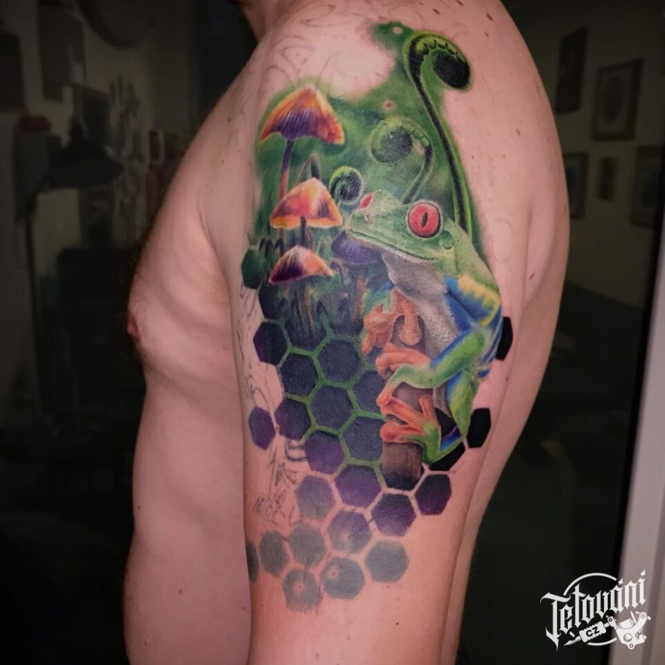 Barevné tetování, zvíře, žába, příroda, tvary na rameno