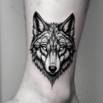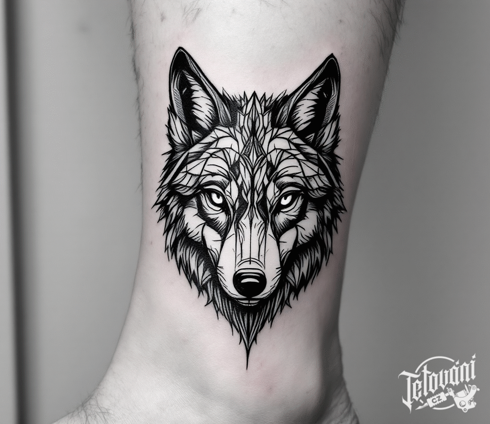 Černo bílé tetování hlava vlka na kotník