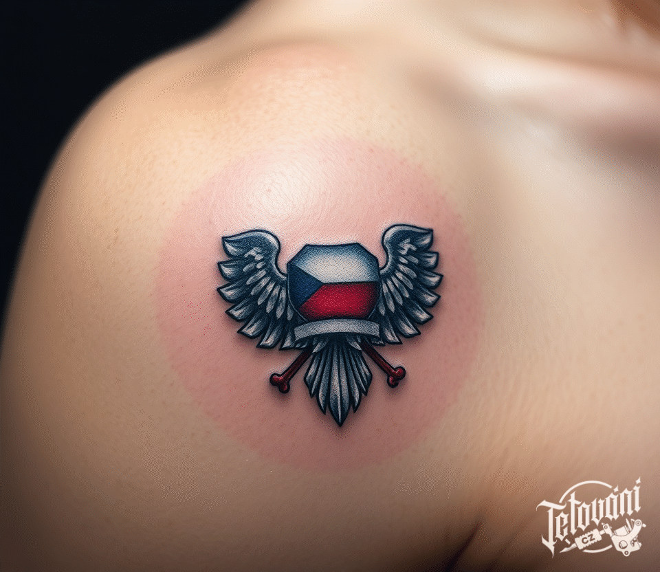 České tetování, české vlastenecké, česká vlajka a křídla moravské orlice na rameno