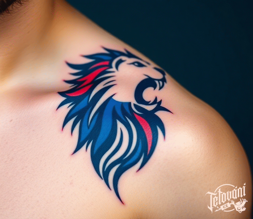 České tetování, české vlastenecké, česká vlajka a zvířata, lev a na klíční kost