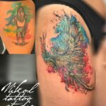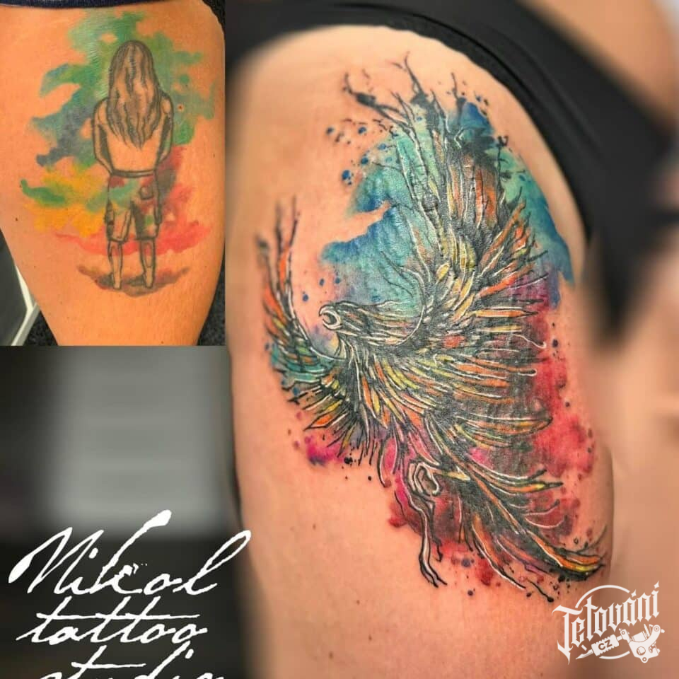 Cover-up tetování mýtické bytosti, fénix na stehně