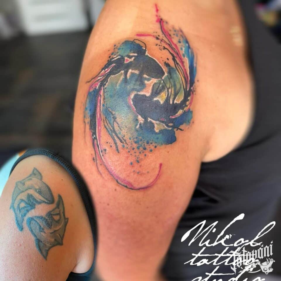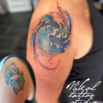 Cover-up tetování znamení zvěrokruhu, ryby na rameni