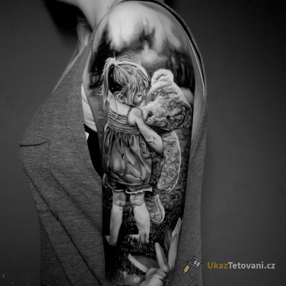 Dítě s medvídkem na rameni