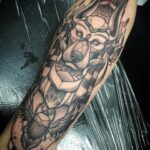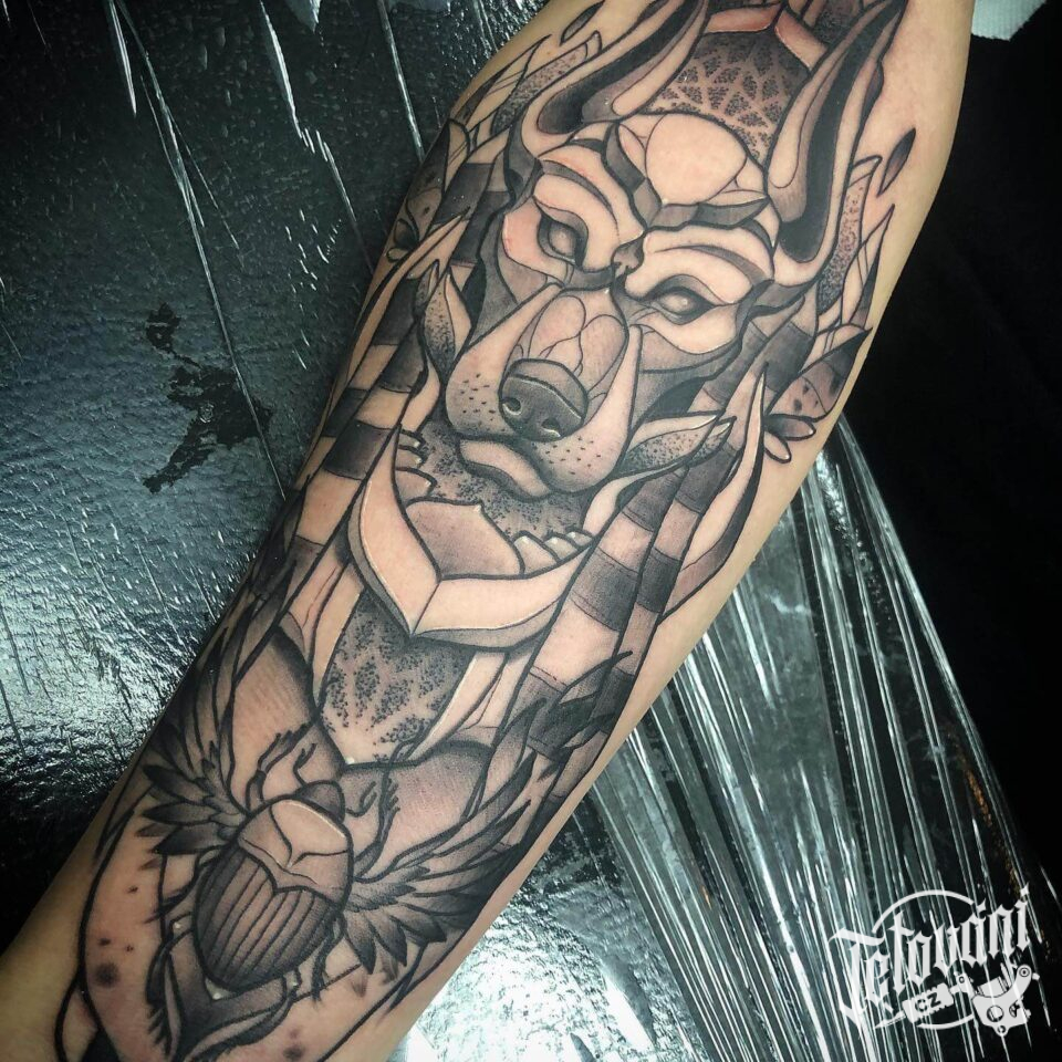 Geometrické Egyptské tetování na předloktí, Anubis a brouk skarabeus