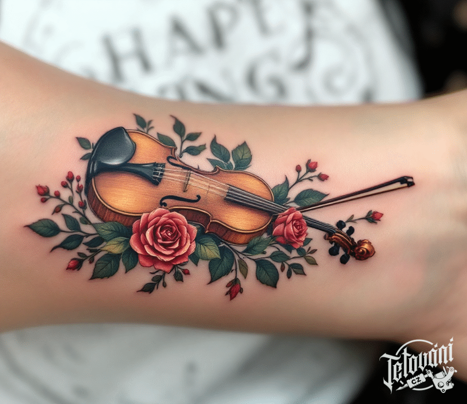 Hudební tetování, housle s růžemi na předloktí